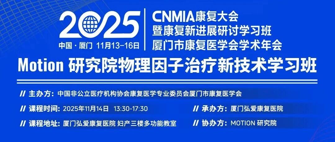 为促进物理因子治疗技术在临床中的规范应用与疗效提升,Motion研究院将于11月14日在厦门弘爱康复医院举办2025·CNMIA康复大会暨厦门市康复医学会2025年学术年会主题学习班——“Motion研究院物理因子治疗新技术学习班”