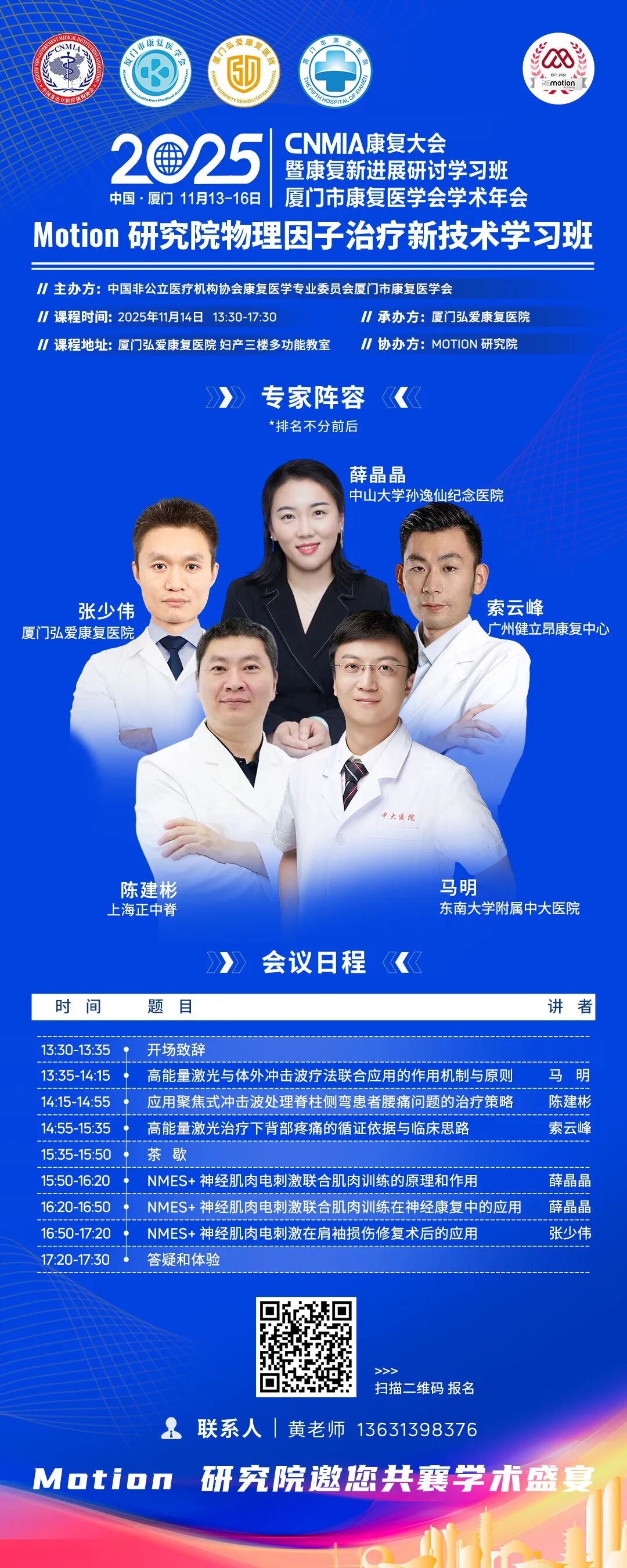 11月13日至16日,中国非公立医疗机构协会康复医学专业委员会2025年学术年会康复新进展研讨学习班暨厦门市康复医学会2025年学术年会在厦门召开,会议期间同步召开会前学习班。为促进物理因子治疗技术在临床中的规范应用与疗效提升,Motion研究院将于11月14日在厦门弘爱康复医院举办2025·CNMIA康复大会暨厦门市康复医学会2025年学术年会主题学习班——“Motion研究院物理因子治疗新技术学习班”。