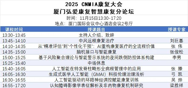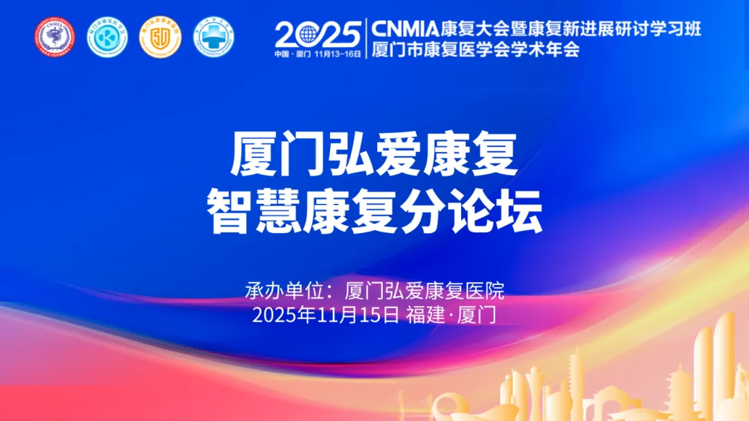 聚焦技术实践与临床需求的结合,2025・CNMIA康复大会暨厦门市康复医学会2025年学术年会特别设置“厦门弘爱康复智慧康复分论坛”,于11月15日13:30-17:20在厦门国际会议中心酒店会议2号厅举办。