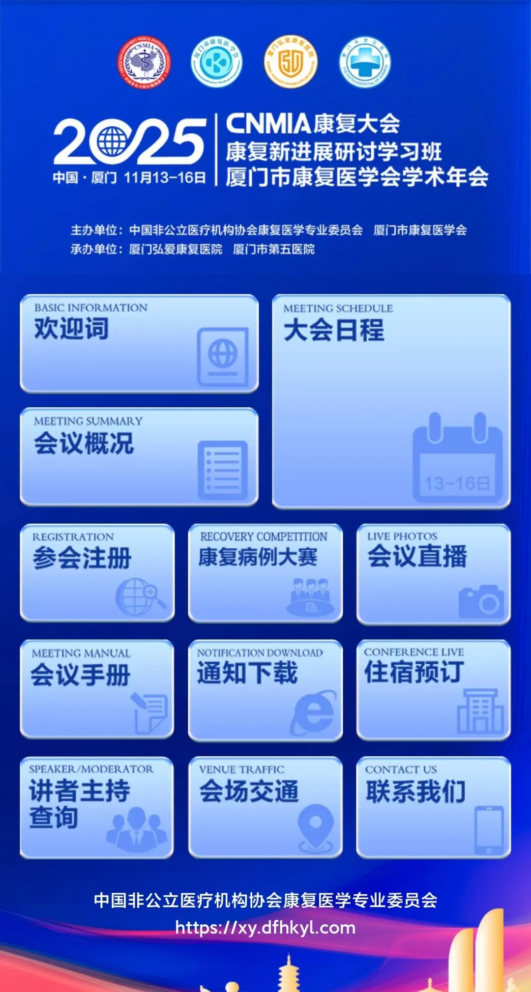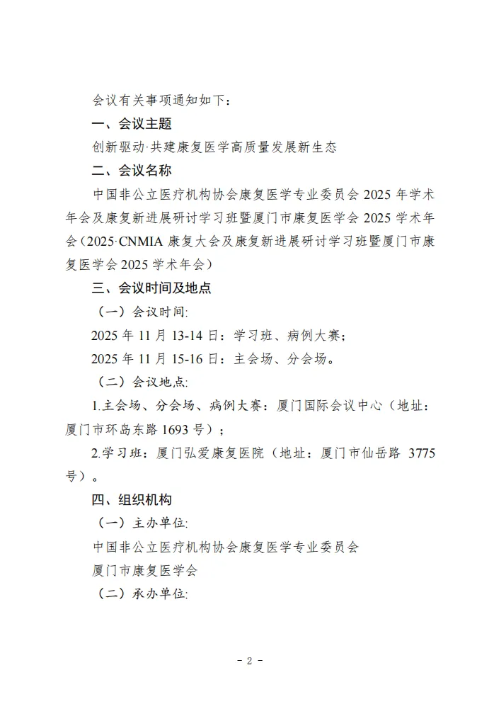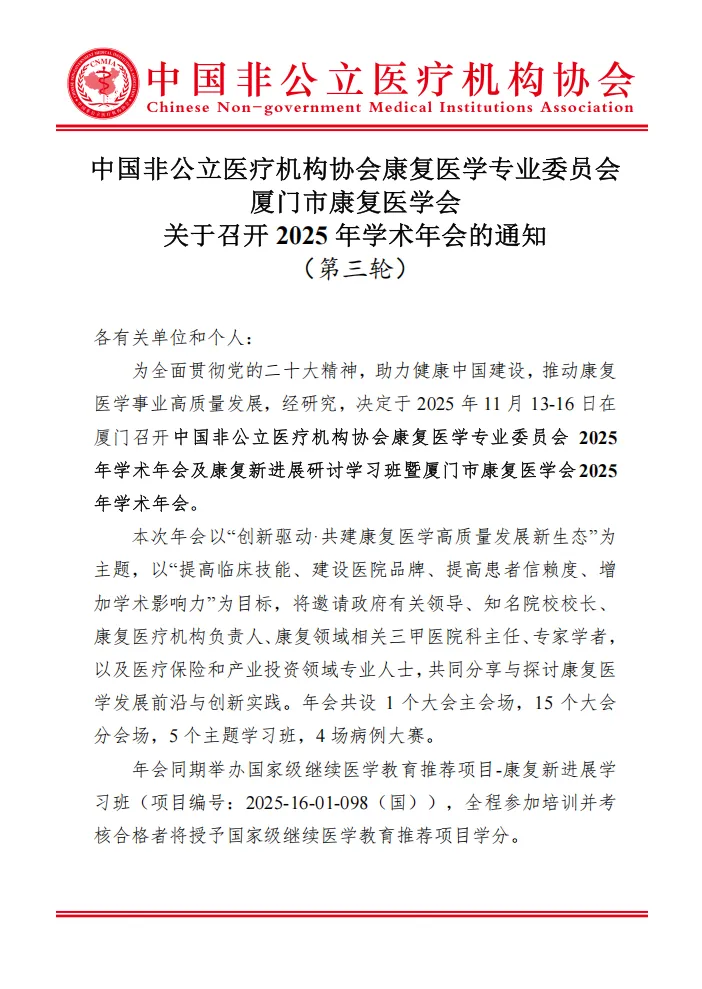 11月13日至16日,中国非公立医疗机构协会康复医学专业委员会2025年学术年会暨厦门市康复医学会2025年学术年会(2025·CNMIA康复大会暨厦门市康复医学会2025年学术年会)将在厦门召开。