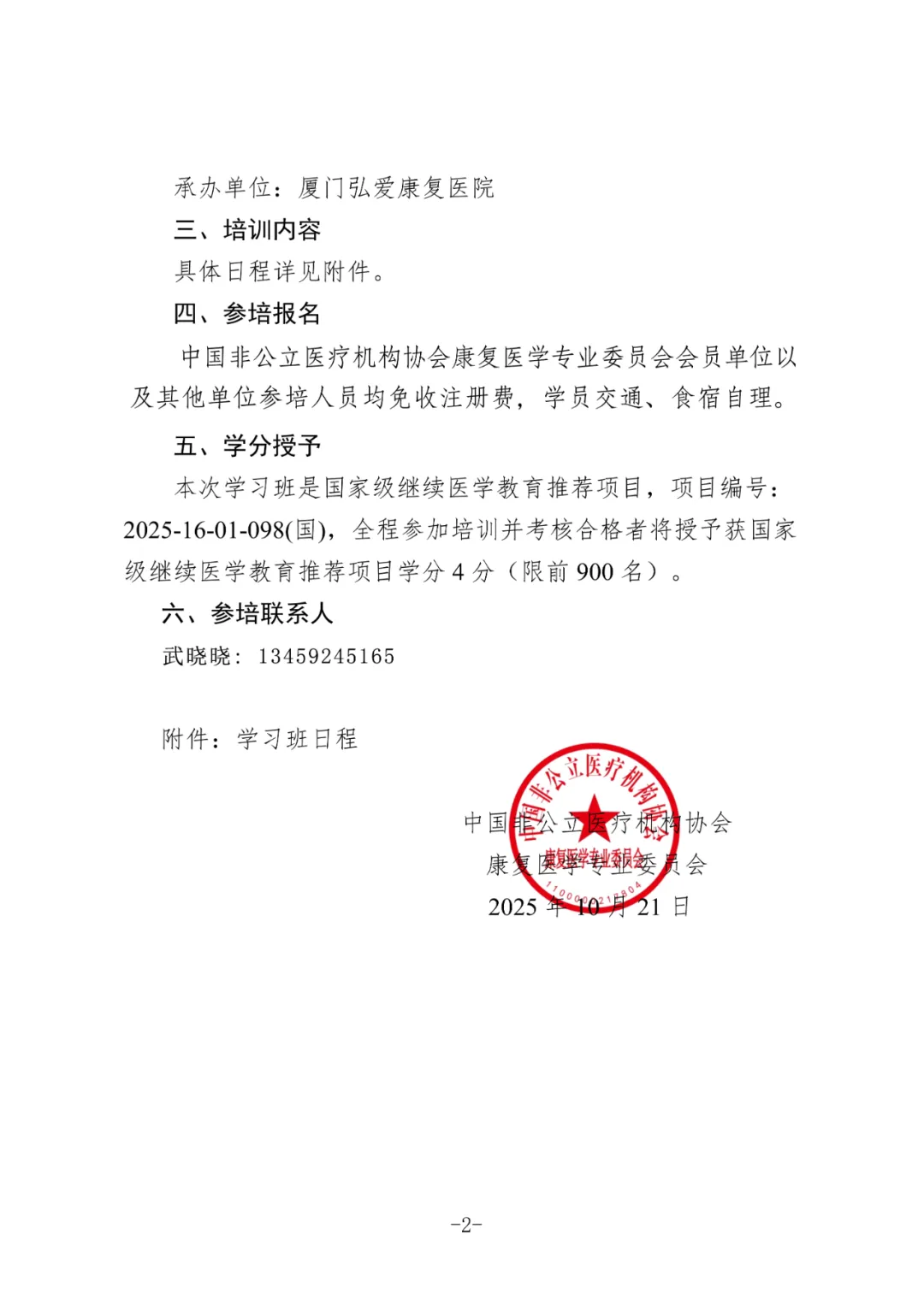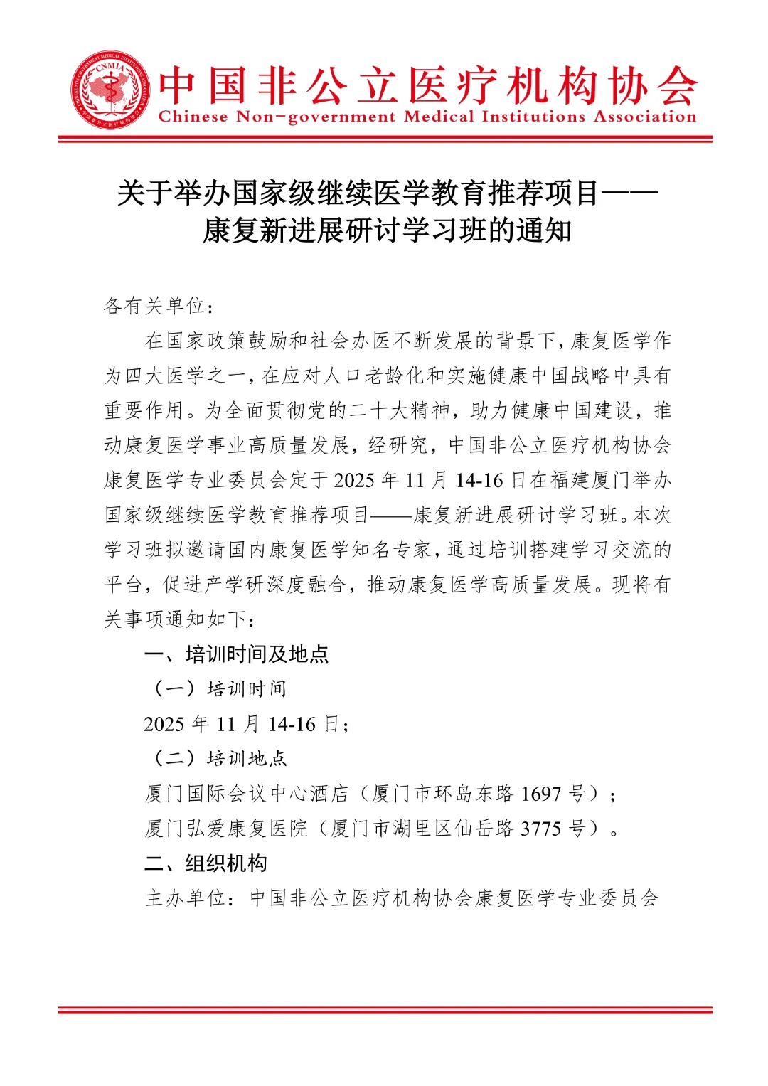 在国家政策鼓励和社会办医不断发展的背景下,康复医学作为四大医学之一,在应对人口老龄化和实施健康中国战略中具有 重要作用。为全面贯彻党的二十大精神,助力健康中国建设,推动康复医学事业高质量发展,经研究,中国非公立医疗机构协会康复医学专业委员会定于2025年11月14-16日在福建厦门举办国家级继续医学教育推荐项目——康复新进展研讨学习班。
